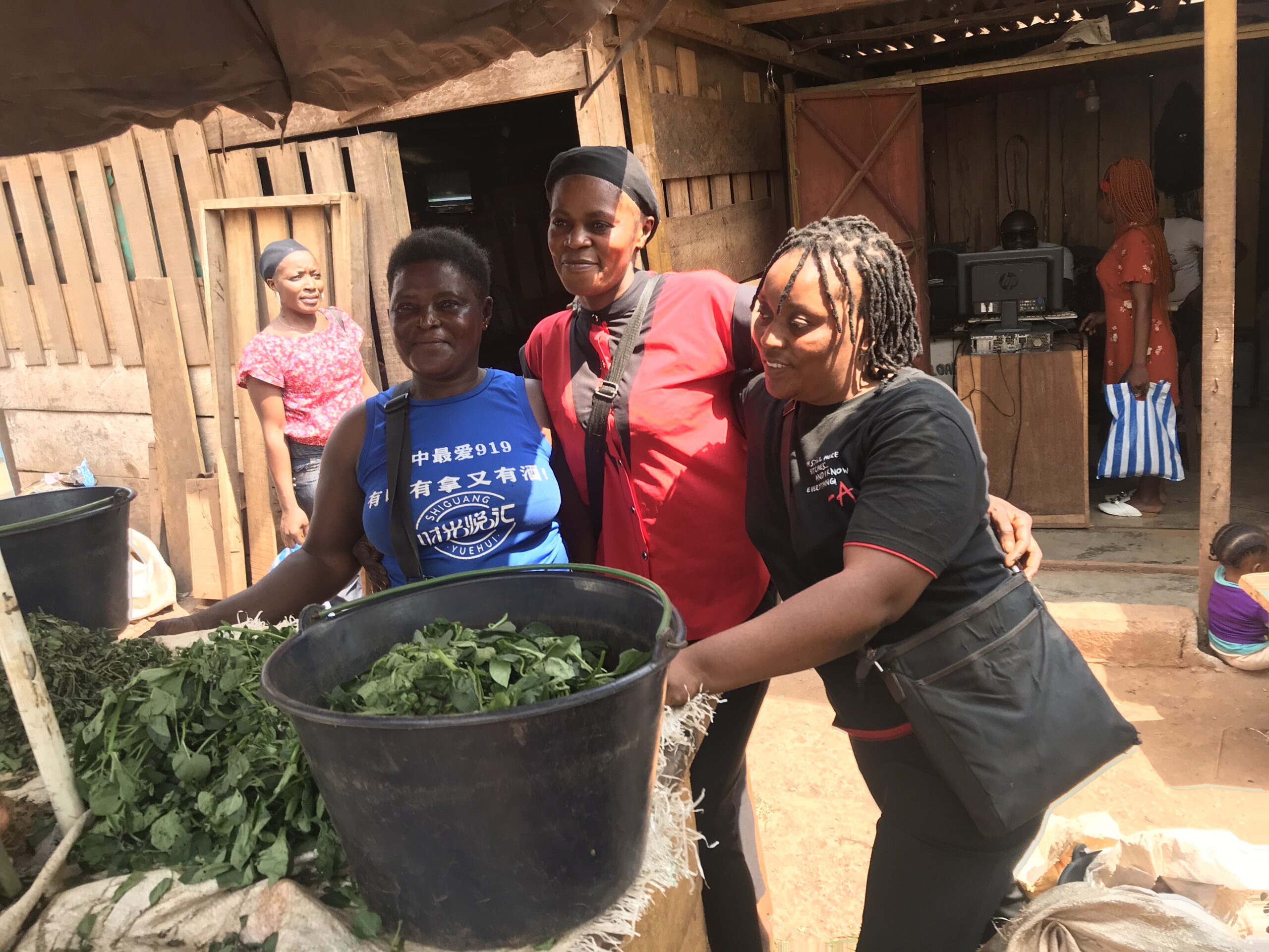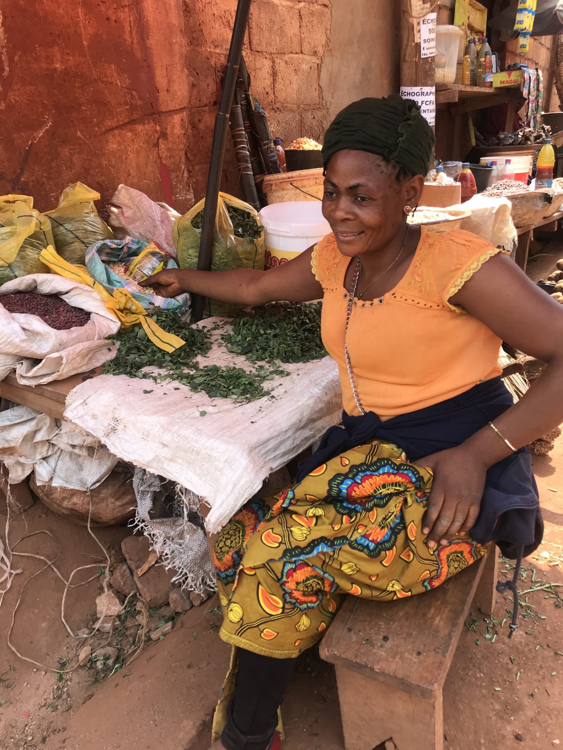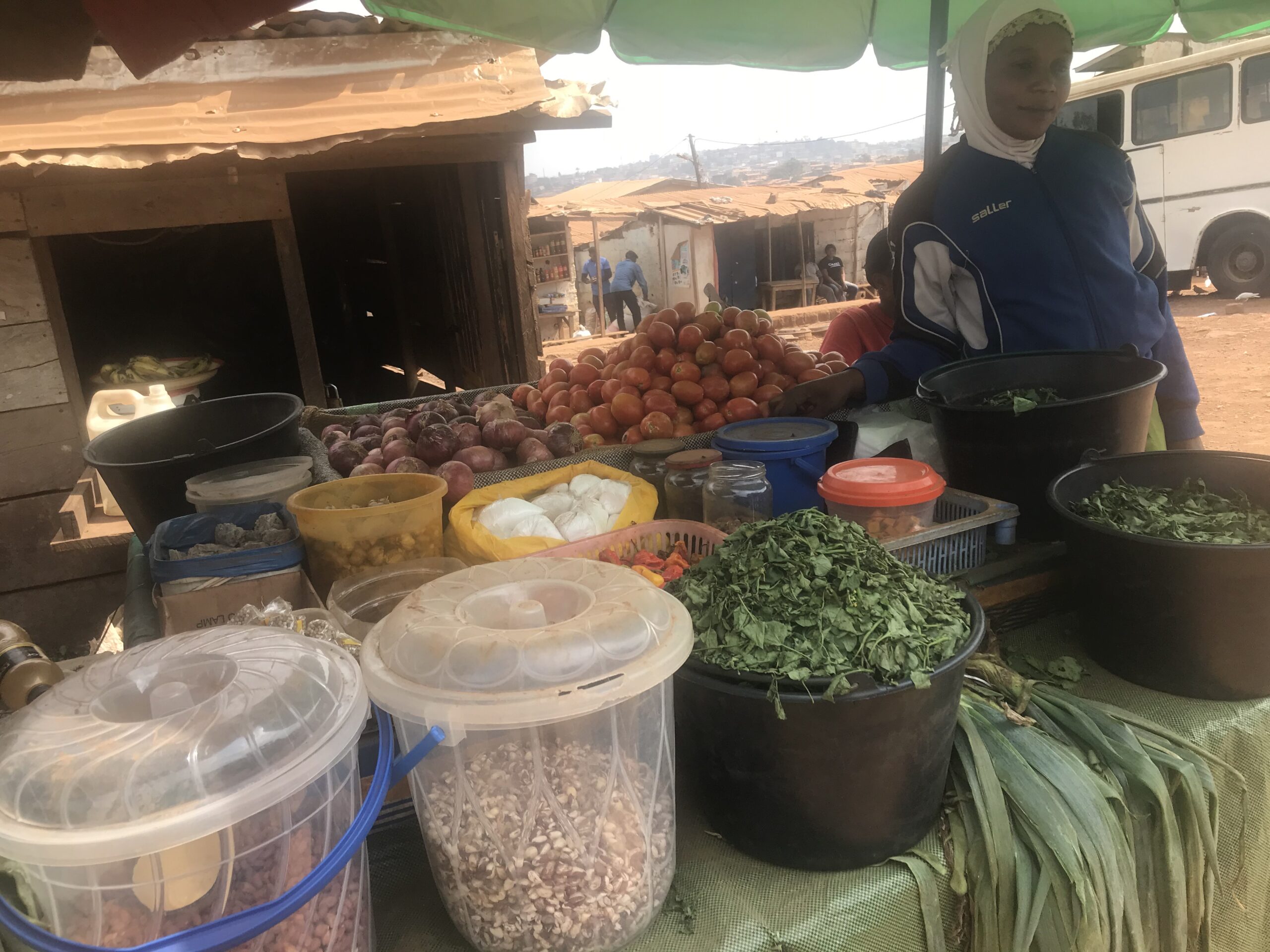Collette moved to Yaounde from Kumbo three years ago with her husband, three children and her brother to escape the violence. She says that anglophone’s in the city prefer food grown in the northwest so she sources her foodstuffs from there as she can get a better price for it. This allows her to pay school fees for the two children that are in school. After her training with SHUMAS she received gari, beans, corn and Maggi seasoning to set up her stall. She has now included Huckleberry, a very popular green vegetable and re- orders her gari, corn and huckleberry from the northwest because the quality is better and she has a ready market amongst the anglophones.
