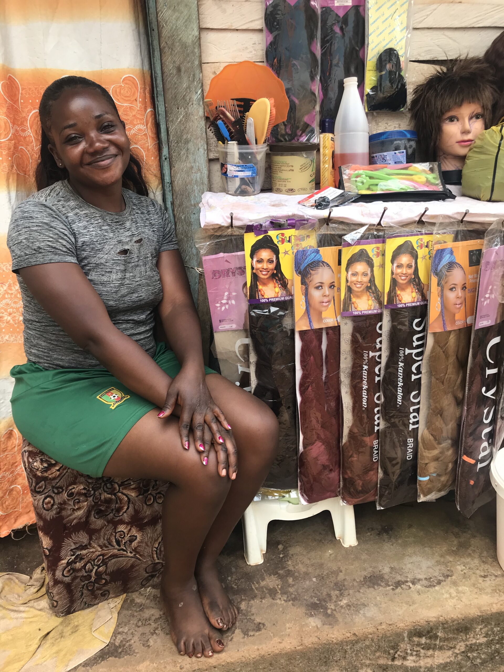 Clarisse came from Kumbo five years ago. She used to be a hairdresser when she used to be in Kumbo but when she arrived in Yaounde she did babysitting work. She has five children and four of them are now back in Kumbo being looked after by her mother. Clarisse took the SHUMAS training in December and received packs of mesh hair to start her business. Unfortunately trade is very slow in January because people don’t have spare money after Christmas but on days like women’s day, teacher’s day and labour day she is very busy. A packet of mesh costs 1,900 CFA and she can sell it for 2,200 CFA. She rents a small shack for 15,000 CFA per month and pays school fees for her youngest child at nursery.