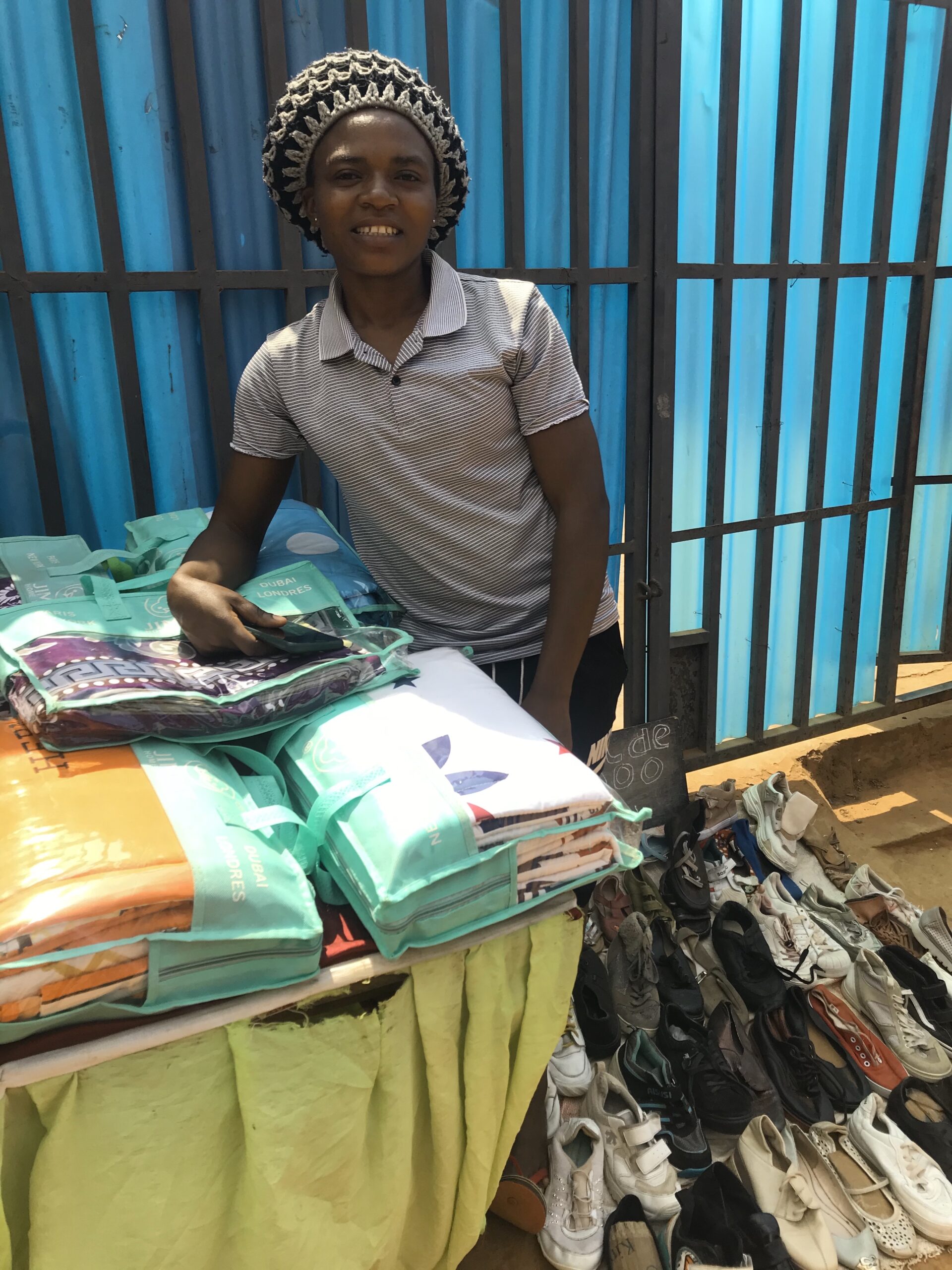 Sidonie moved to Yaounde from Jakiri with her husband and three children, aged 3, 6 and 2. Her husband drives a yellow taxi but only earns money for the family on one day in seven. Sidonie took the SHUMAS training course in December and now makes bedsheets which she packages and sells for 12,000 CFA, making a profit of 4,800 CFA for each set. She really enjoys the training course and she said she learnt things she never knew before. She also buys pairs of shoes from the market and makes a small profit on these.